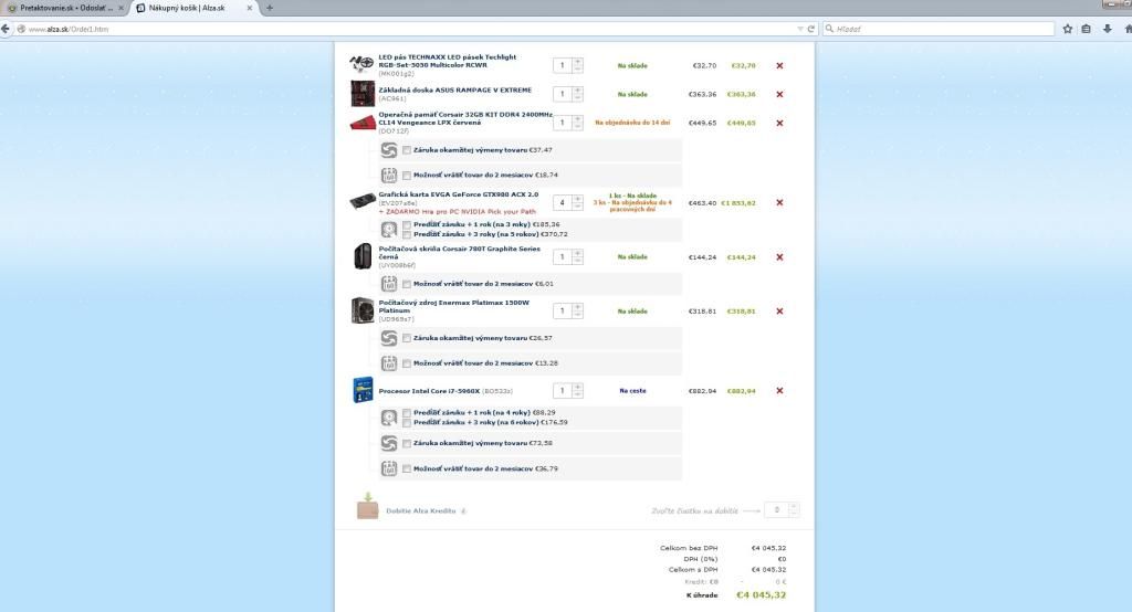 Kým žena je vonku s dcérkou tak som si to tak opatrne skladal, toto som "zostrojil" do hranice 4K (ten led pás som tam zabudol omylom :-D), chýba v tom zvukovka a chladenie, teda ak dobre viem ... Zvládnu sa VGA chladiť pri 4-way? (predpokladám nie, ale možno súdiac z toho, čo som videl testoch). Cooling by sa podľa vás zmestilo do hranice 500€? Respektíve čo tam ešte podľa vás chýba?