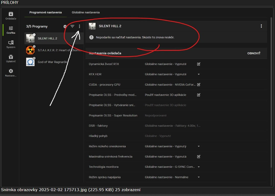 tam jak som ti dal bielu sipku daj obnovit hry...ked nee tak aspon 2x-3x odinstaluj apku a precisti komplet registre a vsetko co po nej ostalo a zase nainstaluj.mne to fungovalo cez apku v pohode.ale hlasia vela problemov s nou.ja som sa nato vysral a fungujem bez tej apky cez profil inspektor.apka ti hodi najnovsi presset K a musis ju mat zapnutu. cez inspektora mozes dat aj presset J ktory ma veksi ghosting ale je cistejsi obraz.aspon tak mi to ide u stalkeraAmd R7 9800x3d = Noctua d15+2xA12x25 G2 = MSI B850 Tomahawk = Kingston 64gb ram 6000mhz cl30 = Rtx 5090 Vanguard = Ssd: M2 WD 850x 1tb Win11 + M2 WD 850x 2tb + 850 evo 2tb = Lian Li 216 black = Fany: 2x Lian Li 160mm-in + 3x Noctua A12x25-out + 2x Noctua A12x25-bottom = FSP Hydro Ti Pro 1kw = LG C2 42" = Per: Log g915 tkl + Log g pro wire + g440 hard + Xbox Wire Controller = Audio: Topping dx5 II = Mackie mr524 = Meze 99 classics V2
